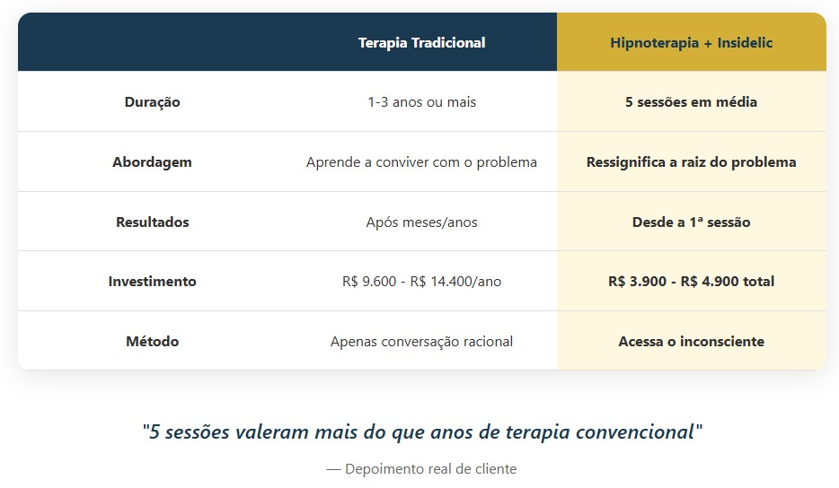 Através da hipnoterapia combinada com o Método Insidelic, conseguimos acessar e integrar memórias que geram sofrimento, permitindo que seu sistema emocional se reorganize naturalmente.